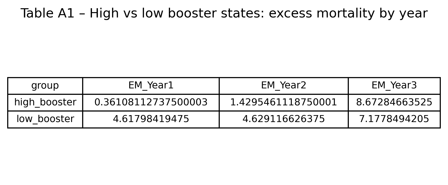 Table A1 – High vs low booster states: excess mortality by year