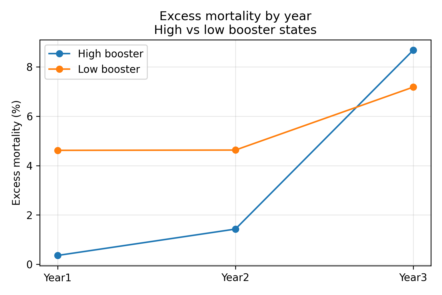 So high‑booster states start with lower excess mortality and end with higher excess mortality than low‑booster states. That three‑year flip is visible even before any modelling.