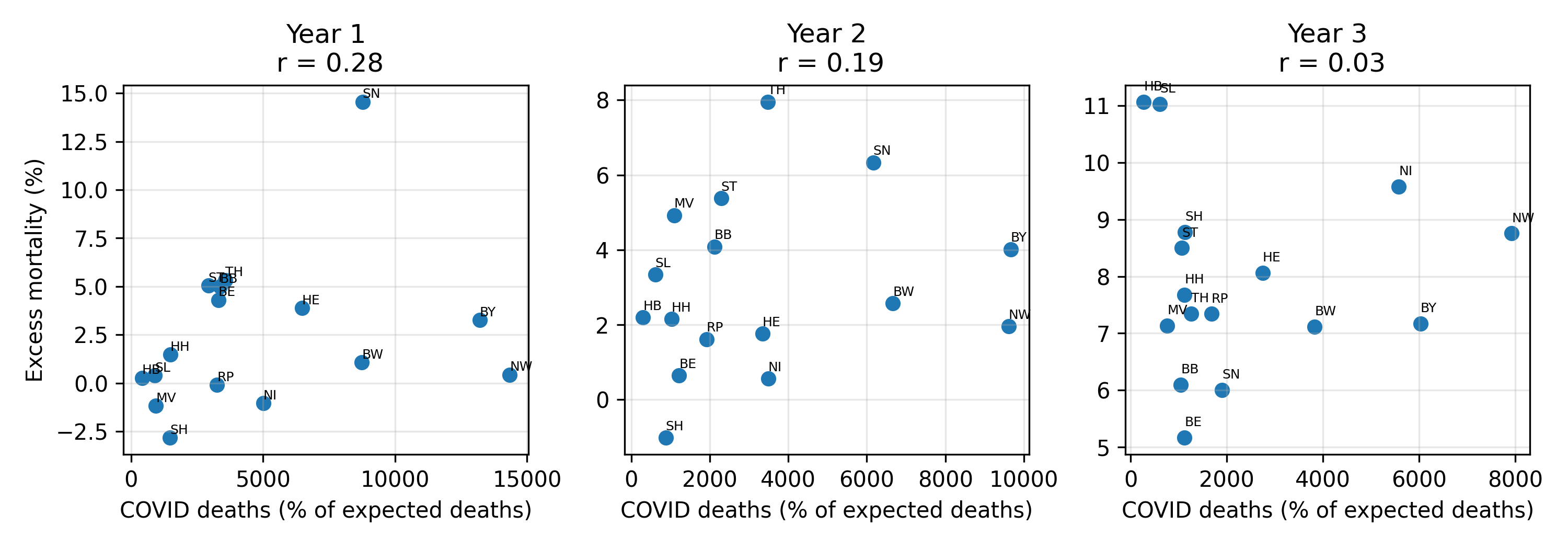 Instead, the relationship between COVID deaths and excess mortality shifts over time, and by Year 3 the two are largely decoupled: regions with more COVID‑labelled deaths are not necessarily the ones with the highest all‑cause excess mortality.