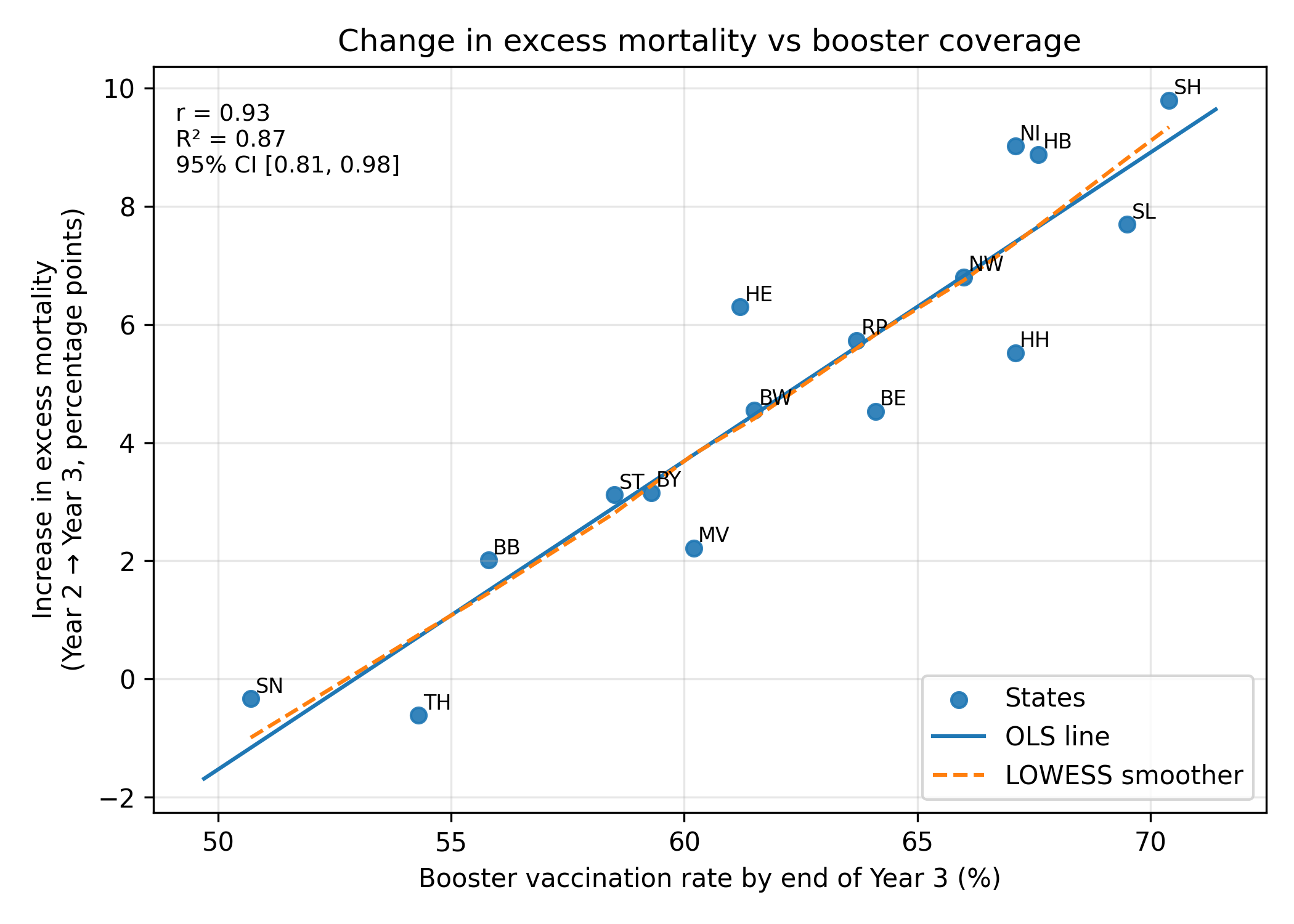 In other words, about 87% of the variance in the Year‑3 mortality jump across states is aligned, in a simple linear way, with booster coverage. A Spearman (rank‑based) correlation gives a very similar story.